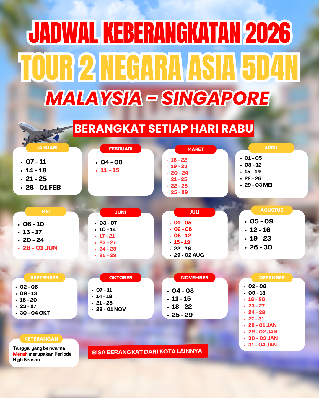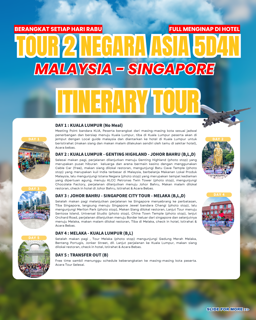DAY 3 : JOHOR BAHRU – SINGAPORE CITY TOUR – MELAKA (B,L,D) Setelah makan pagi melanjutkan perjalanan ke Singapore menyebrang ke perbatasan, Tiba Singapore, langsung menuju Singapore Jewel Changi Airport (photo stop), lalu mengunjungi Merlion Park (photo stop), Makan Siang dilokal restoran, Lanjut Tour menuju Sentosa Island, Universal Studio (photo Stop), Photo Stop China Town Temple, lanjut Orchard Road, perjalanan dilanjutkan menuju Border keluar dari singapore dan selanjutnya menuju Melaka, makan malam dilokal restoran, Tiba di Melaka, check in hotel, Istirahat & Acara Bebas.